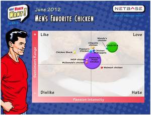 MOUNTAIN VIEW, CA -- (Marketwire) -- 06/06/12 -- NetBase, the Enterprise Social Intelligence (ESI) Platform company, today unveiled the latest installment of its What Women Want study, an analysis of more than 27 billion conversations in social media over one year to uncover the top ten things that men and women want. Eighty percent of their top five wants, and the corresponding BPI series, focused on food. This week's Brand Passion Index is no exception, taking a look at men's and women's emotions, opinions and behaviors on the topic of chicken brands.