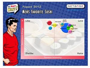 MOUNTAIN VIEW, CA -- (Marketwire) -- 08/08/12 -- NetBase, the Enterprise Social Intelligence (ESI) Platform company, today unveiled the latest installment of its What Women Want study, an analysis of more than 27 billion conversations in social media over one year to unearth the top ten things that men and women want. Food dominated both gender's top ten lists, and today's Brand Passion Index (BPI) was no exception, featuring sushi and the associated emotions, opinions and behaviors expressed by men and women through social media.