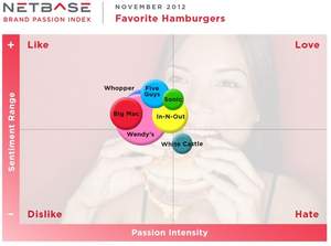 MOUNTAIN VIEW, CA -- (Marketwire) -- 11/28/12 -- NetBase, the Enterprise Social Intelligence (ESI) Platform company, today announced the latest Brand Passion Index, an analysis of consumer conversations online about seven burger brands. The Index is powered by the Insight Composer, which measured the behaviors, emotions and opinions about these burgers: Big Mac (McDonald's), Whopper (Burger King), Sonic, In-N-Out, White Castle, Wendy's, and Five Guys.