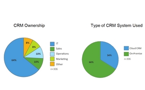 4. SMBs report the CRM is owned by IT in 64% of cases, followed by Sales (10%), Operations (10%), Marketing (8%), and other departments at 8%. SMBs also largely report continued on-premise instances of CRM, in 66% of cases. An additional 34% of SMBs report cloud-based CRM systems.