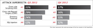 Each quarter, FireHost reports on the Superfecta -- a group of four cyberattacks that are the most dangerous -- and warns that both Cross-Site Scripting and SQL Injection attacks have become even more prevalent since the third quarter of 2012. The four attack types which make up the Superfecta, and which pose the most serious threat to the private information hosted in your database are Cross-site Scripting (XSS), Directory Traversal, SQL Injection, and Cross-site Request Forgery (CSRF).
