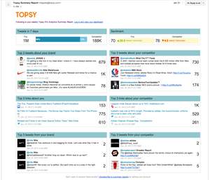 "Topsy Reports" are regular email digests of particular topics that are relevant to senior executives and managers, such as a comparison between the company's brand versus its competitors', or mentions of particular stock ticker symbols. Topsy analyzes all traffic for the report time period and then picks out the top most important and insightful Tweets, News Articles and other media to include in the report. Reports show summary statistics for the topic, information on relative sentiment between brands, and lists of the Top Tweets, Links and Media. Topsy also provides statistics that allow executives to assess the impact and traction a story is getting, so they can put the news in the appropriate context and quickly determine whether action is required.