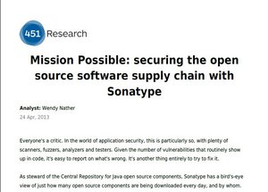 "Sonatype is sitting on a golden opportunity in the form of an unprecedented amount of leverage. If more than 80 percent of enterprise software does indeed contain open-source components, and those can not only be sourced from a validated repository, but also updated by the developer to more secure versions with a few mouse clicks -- well, you do the math," said Wendy Nather, Research Director, Enterprise Security Practice at 451 Research. "Short of parachuting in crack programming SWAT teams, there will probably be no easier way for enterprises to improve the security of their existing code at something approaching both low cost and large scale."