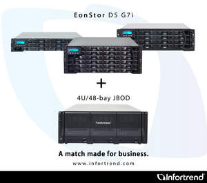 The EonStor DS G7i Series is designed specifically to match the needs of aggressive and complex applications housed in Tier III data centers. VMware VAAI-Ready and boasting high-availability product design features such as RAID controllers, CacheSafe technology, and hot-swappable components ensure that stored data is safe in the event of an untimely power outage or drive failure. The "scale as you grow" flexibility of the G7i series allows companies to scale up to 240 disk drives through high-density expansion enclosures, including Infortrend's 4U/48-bay JBOD.